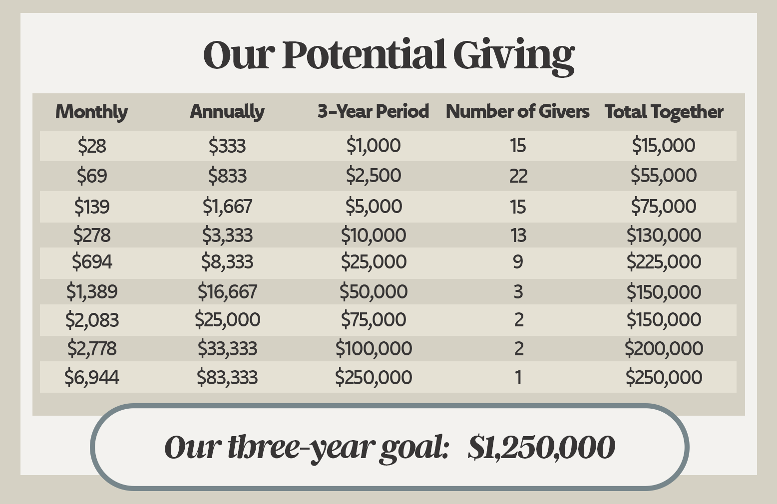 Below is a breakdown showing how every gift works together to help us reach our goal. Whether you can give $30 a month or $2,000 a month, you can help us accomplish our renovation. We trust you will prayerfully seek the Lord’s wisdom as you consider how you might contribute (2 Cor. 9).